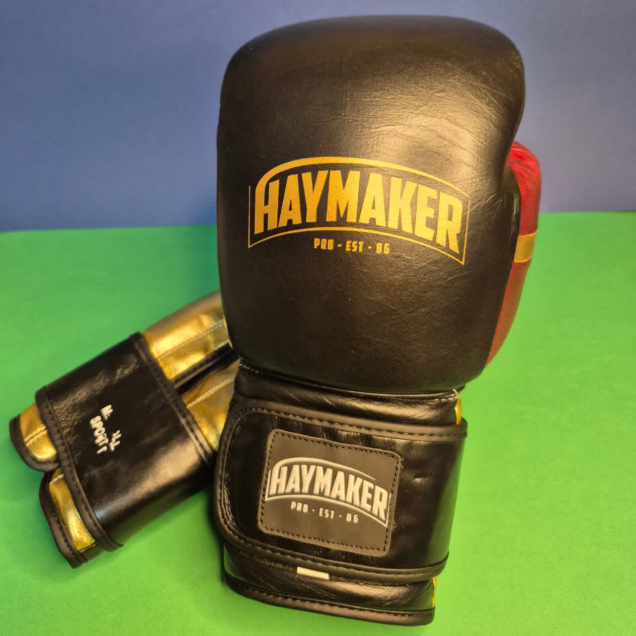 دستکش بوکس چسبی حرفه ای HAYMAKER رنگ مشکی بسیار جذاب مناسب تمرین و کیسه زنی و اسپارینگ . کیفیت درجه یک . سایز 14 اونس